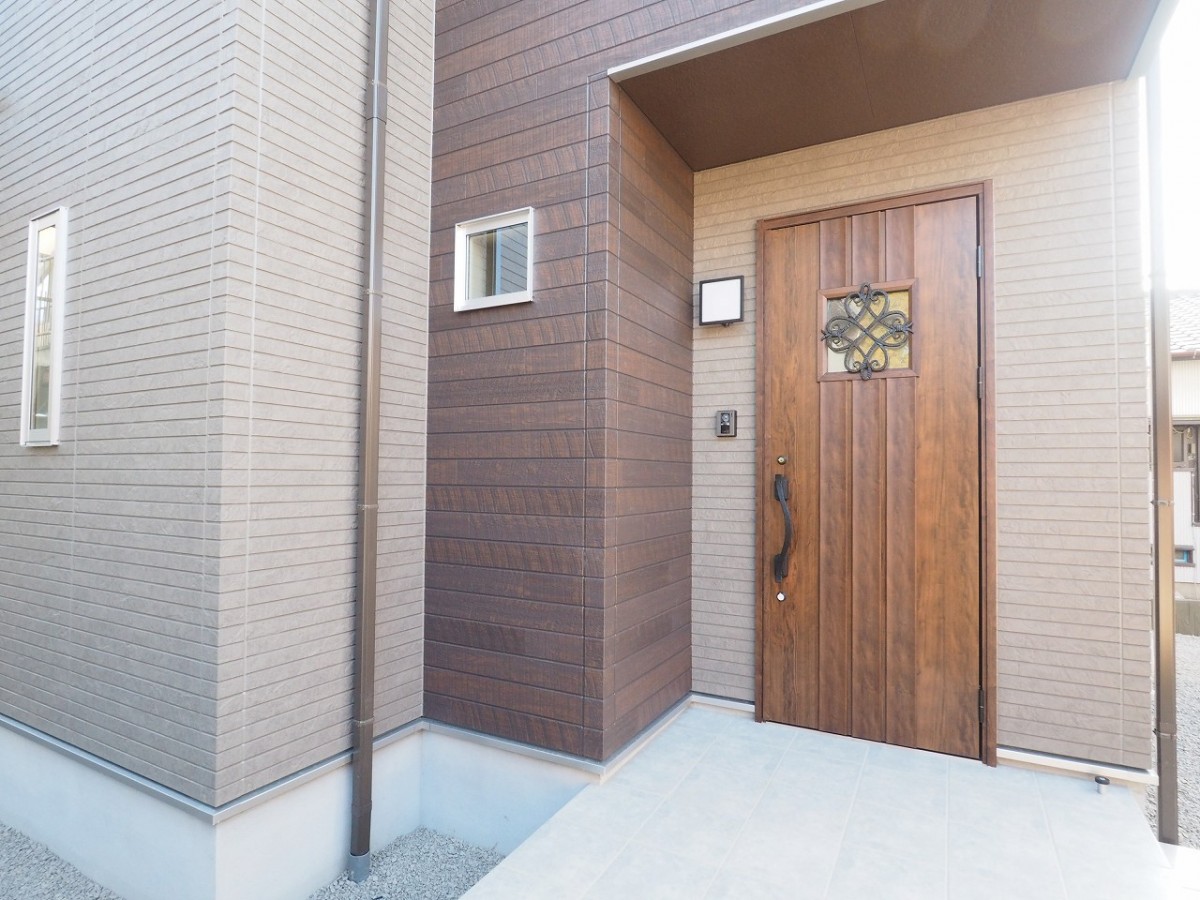 外観デザインに合わせたシンプルでおしゃれな玄関ドア。木のぬくもりを感じられるウッド調が素敵です!