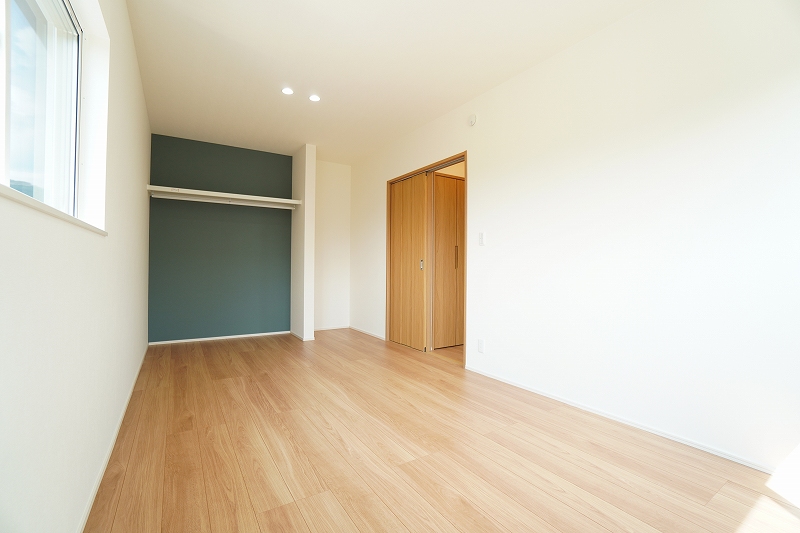 少し広めな2階主寝室。日当たり良好でバルコニーへも窓から出入りできます。 ウォークインクローゼットとも繋がっています。
