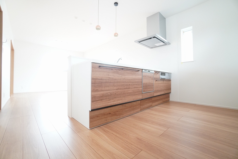 アクセントとなるウッド調が使用されたキッチン。落ち着いた雰囲気で、2つのペンダントライトがよりおしゃれ度を上げています。