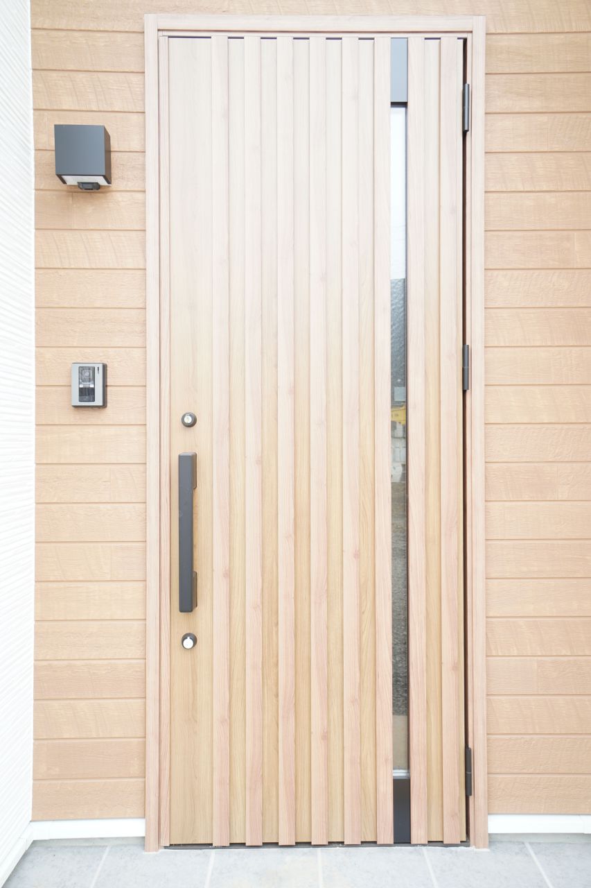 外観デザインに合わせたシンプルでおしゃれな玄関ドア。木のぬくもりを感じられるウッド調が素敵です!