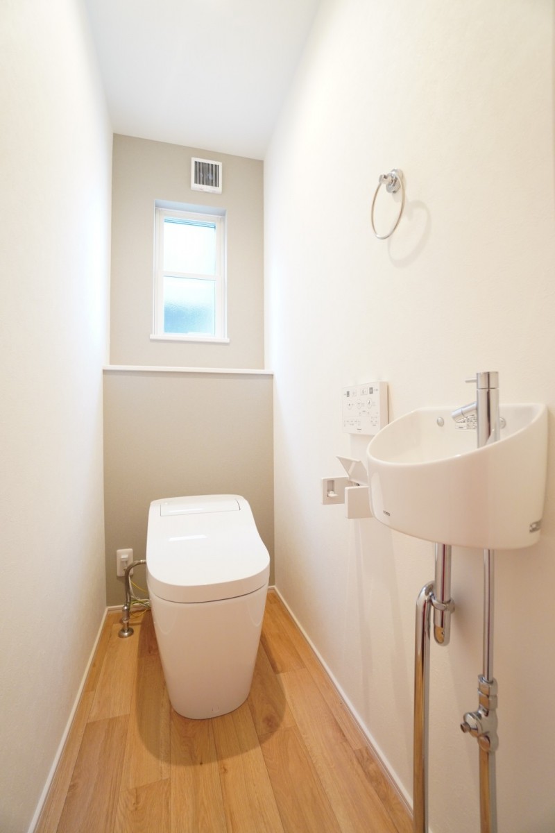 柔らかい空間で落ち着くトイレ。掃除がしやすく見た目もすっきりなタンクレスタイプなのも嬉しいですね♪