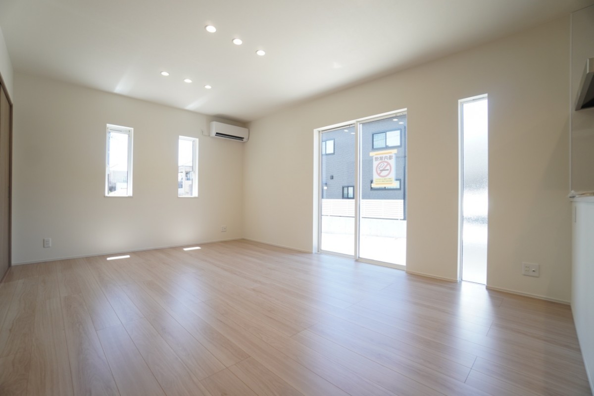 • 16帖LDK。窓から明るい日差しが差し込みます♪ダイニングテーブルやソファ、テレビボードを十分に置ける広さです♪