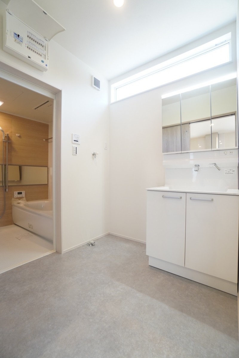 • 鏡裏に収納スペースがある洗面台を採用。小物を隠せるため、見た目がスッキリします♪ 湿気が気になる洗面所には、耐水性に優れたクッションフロアを採用。