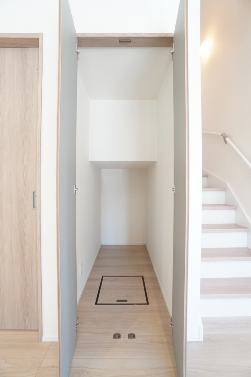 • リビング収納。収納スペースを設けることで、物が散乱せず、スッキリとしたリビングを維持できます。
