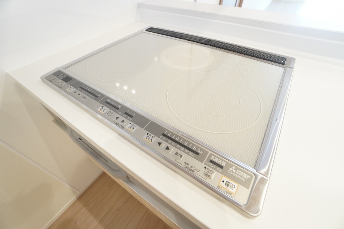 拭き掃除が楽々なIHコンロ。火を使わない安心感もあります!キッチンパネルは凹凸がなく、お手入れが簡単です。