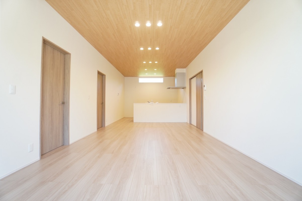 20帖の広さがあり、天井が1段高くなっていることやオープンキッチンを採用することで、より開放的な空間になっています♪
