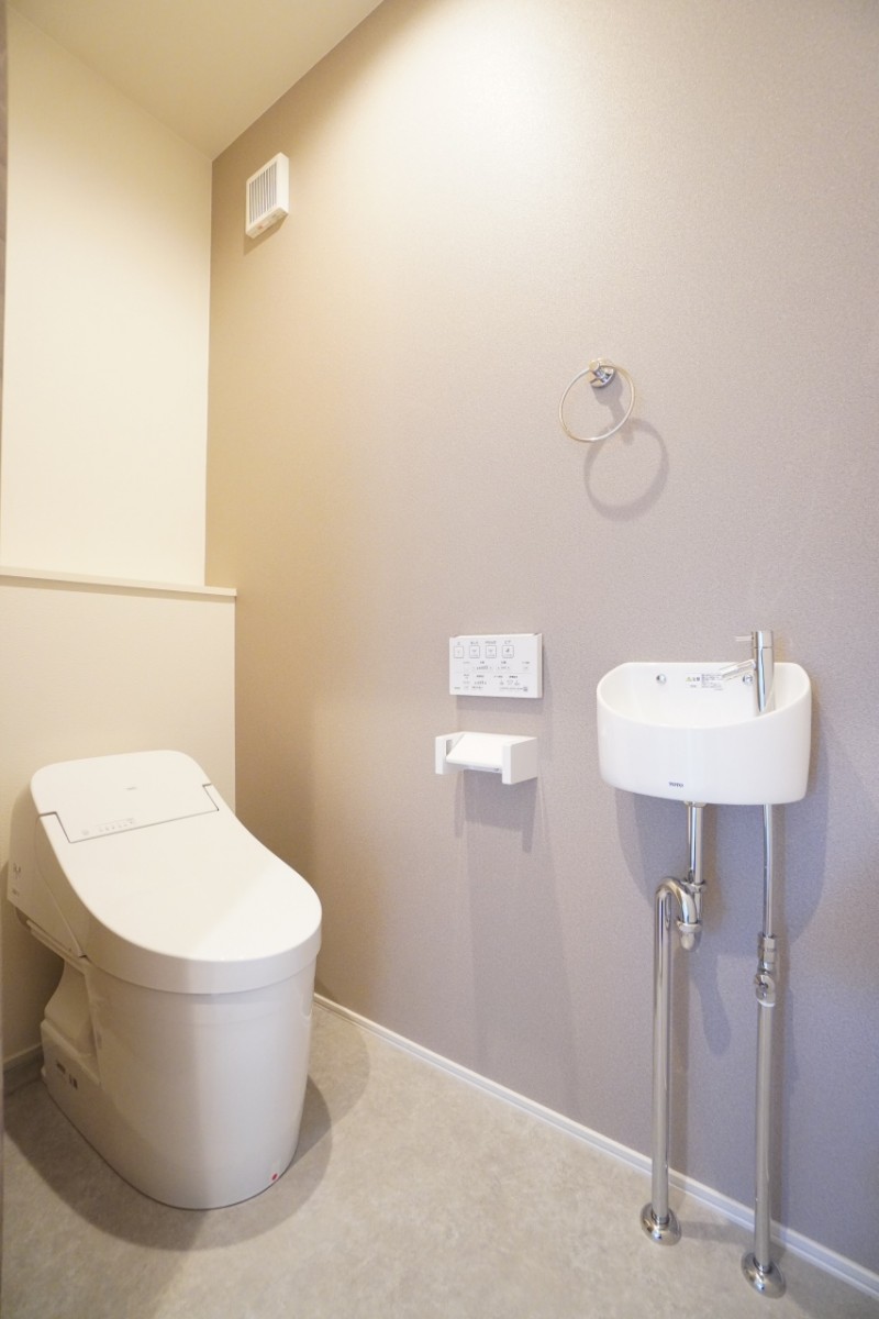 スタイリッシュなデザインのタンクレストイレを採用!タンクありのトイレと比べると1回あたりに使用する水の量はなんと1/3以下。