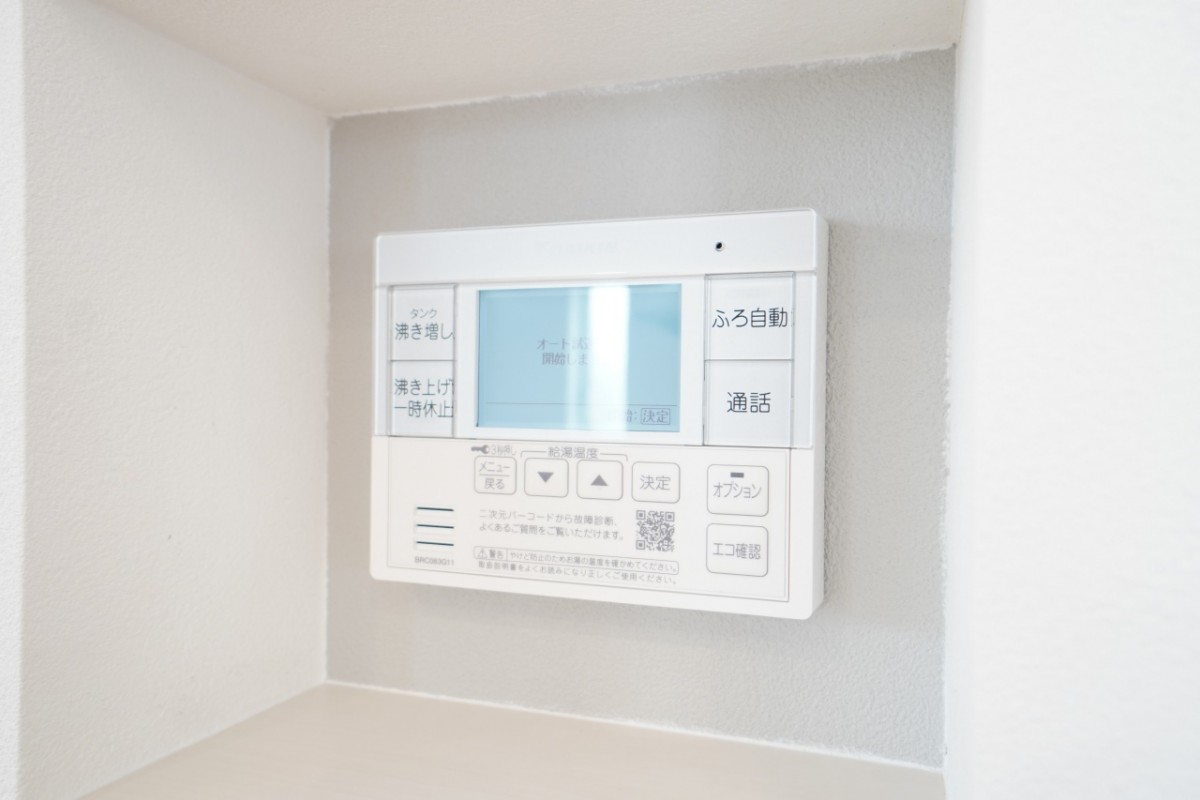• 給湯器の操作パネルです。ボタン一つであたたかいお風呂に入れます。ヒートショック防止の観点からもあると嬉しい機能です。