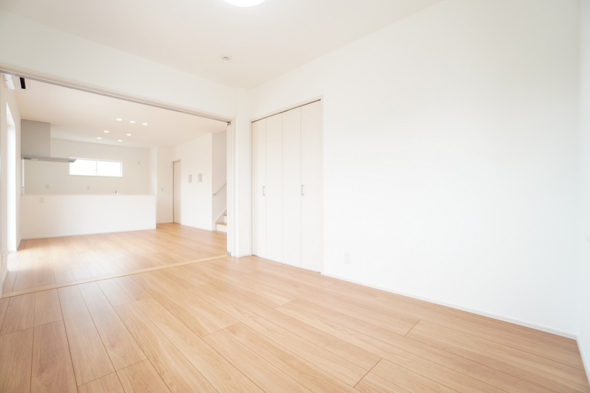 • 1階6帖洋室。リビングと3枚扉で繋がっています♪収納あり、小さなお子様を遊ばせる部屋や1階の寝室としても利用できます。