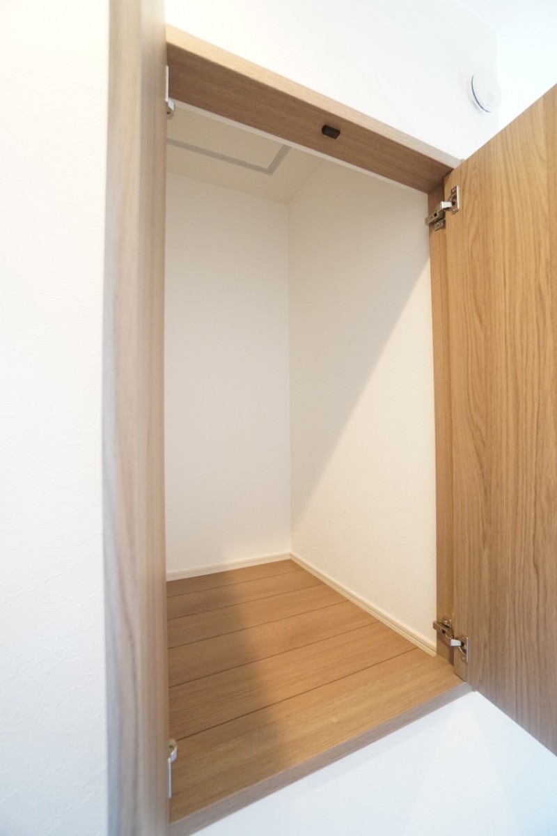 玄関収納はトイレ、洗面所、浴室にも近いため買ってきたストック用品の一時保管場所として使っていただくのもよさそうです。