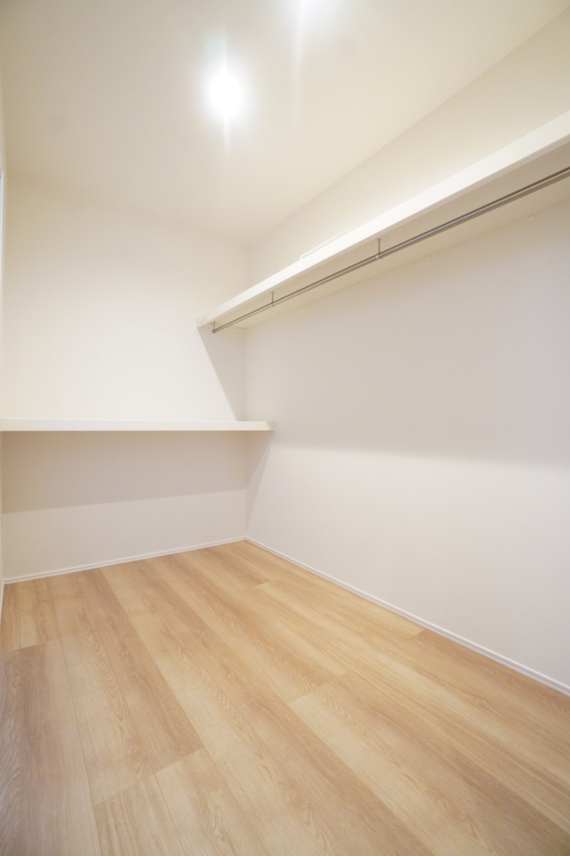 廊下から、脱衣所からも出入り可能なファミリークローゼット。家族の衣類を一か所でまとめて収納できます。脱衣所の近くに設置することで家事効率の良くなります。
