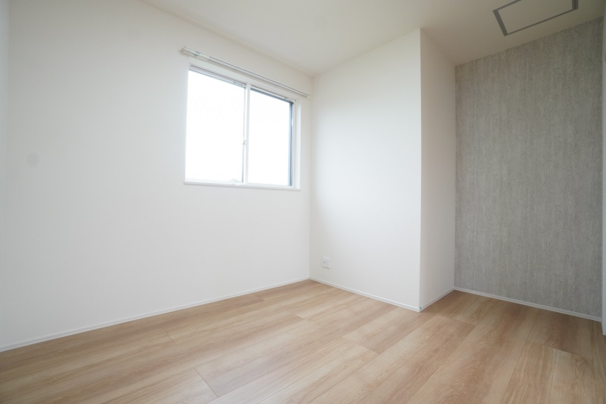 6帖洋室。アクセントクロスの色や柄でお部屋の雰囲気を変えています。 窓ガラスはLow eガラスを使用した複層ガラスで遮熱・防音性の高い窓になっています。