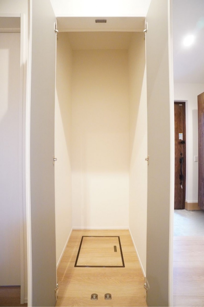 玄関収納はトイレ、洗面所、浴室にも近いため買ってきたストック用品の一時保管場所として使っていただくのもよさそうです。