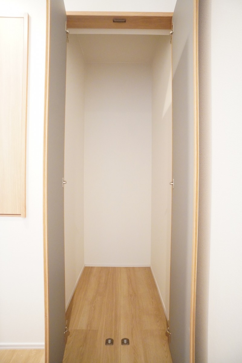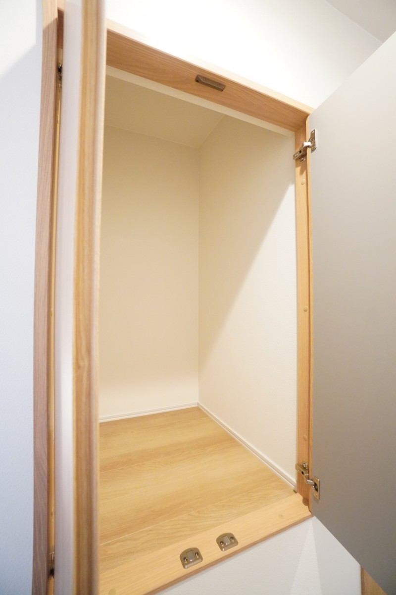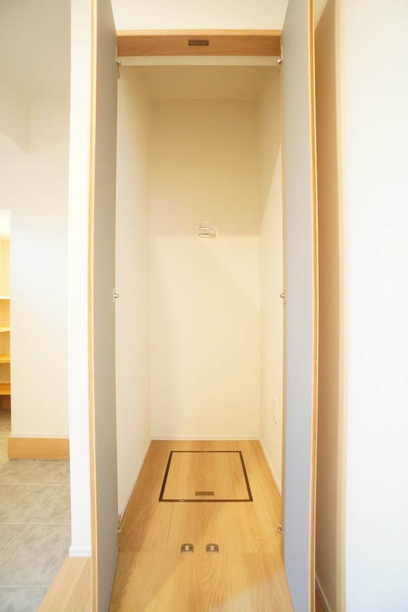 玄関収納はトイレ、洗面所、浴室にも近いため買ってきたストック用品の一時保管場所として使っていただくのもよさそうです。