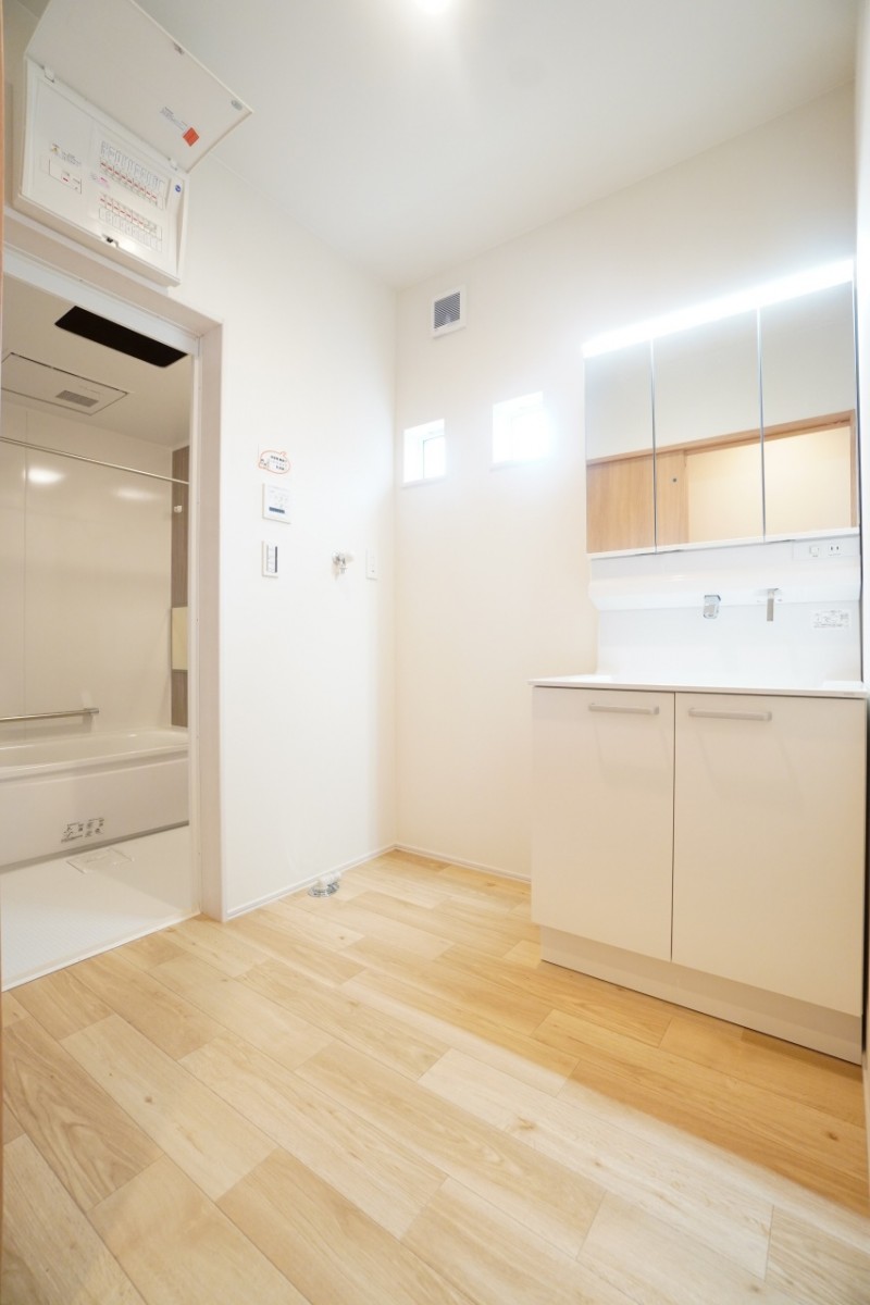 鏡裏に収納スペースがある洗面台を採用。小物を隠せるため、見た目がスッキリします♪ 湿気が気になる洗面所には、耐水性に優れたクッションフロアを採用。
