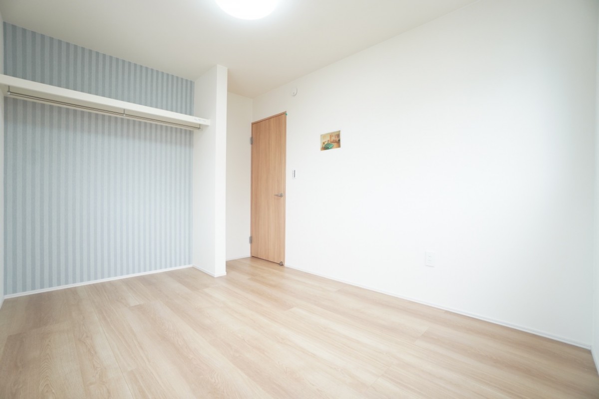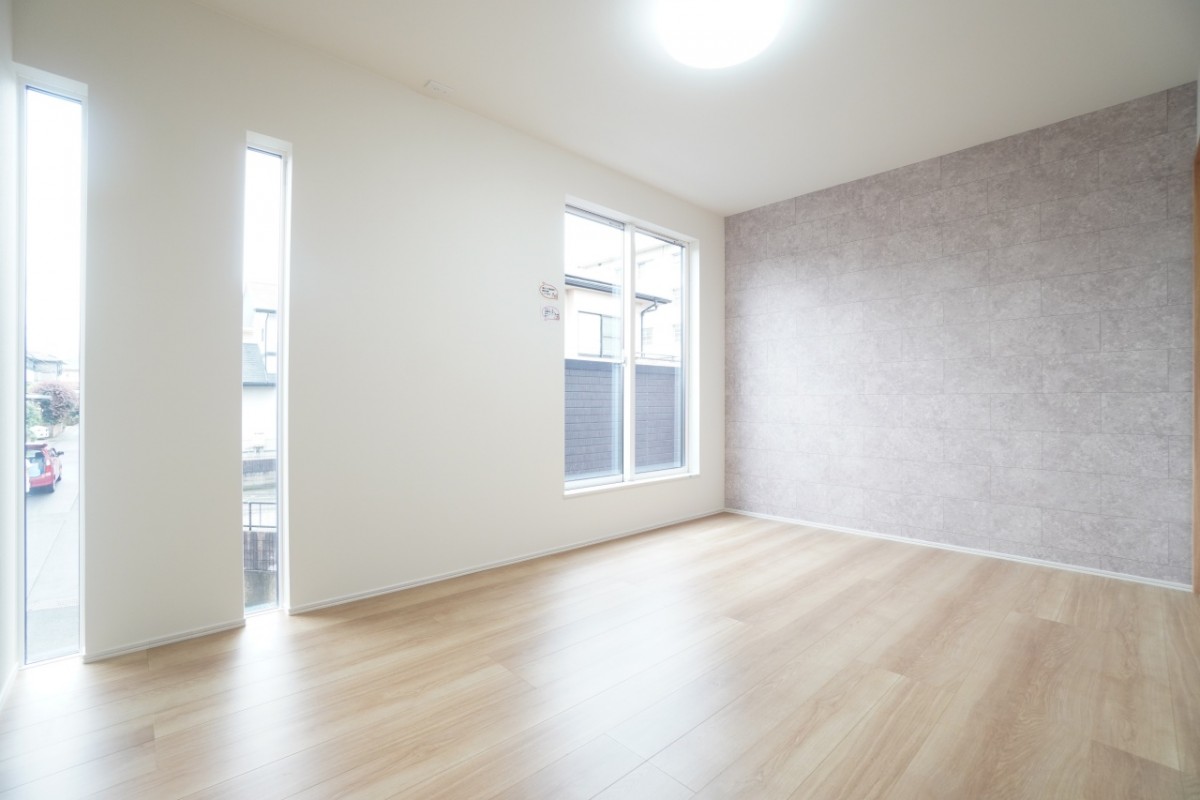 2階6帖洋室。壁にはアクセントクロスが採用されており、部屋の印象を変える役割があります。ロールカーテンをつければ収納を隠すこともできちゃいます。
