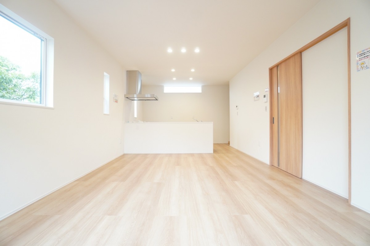 16帖リビング。ダイニングテーブルのほかにテレビ台なども余裕を持って置いていただけます。