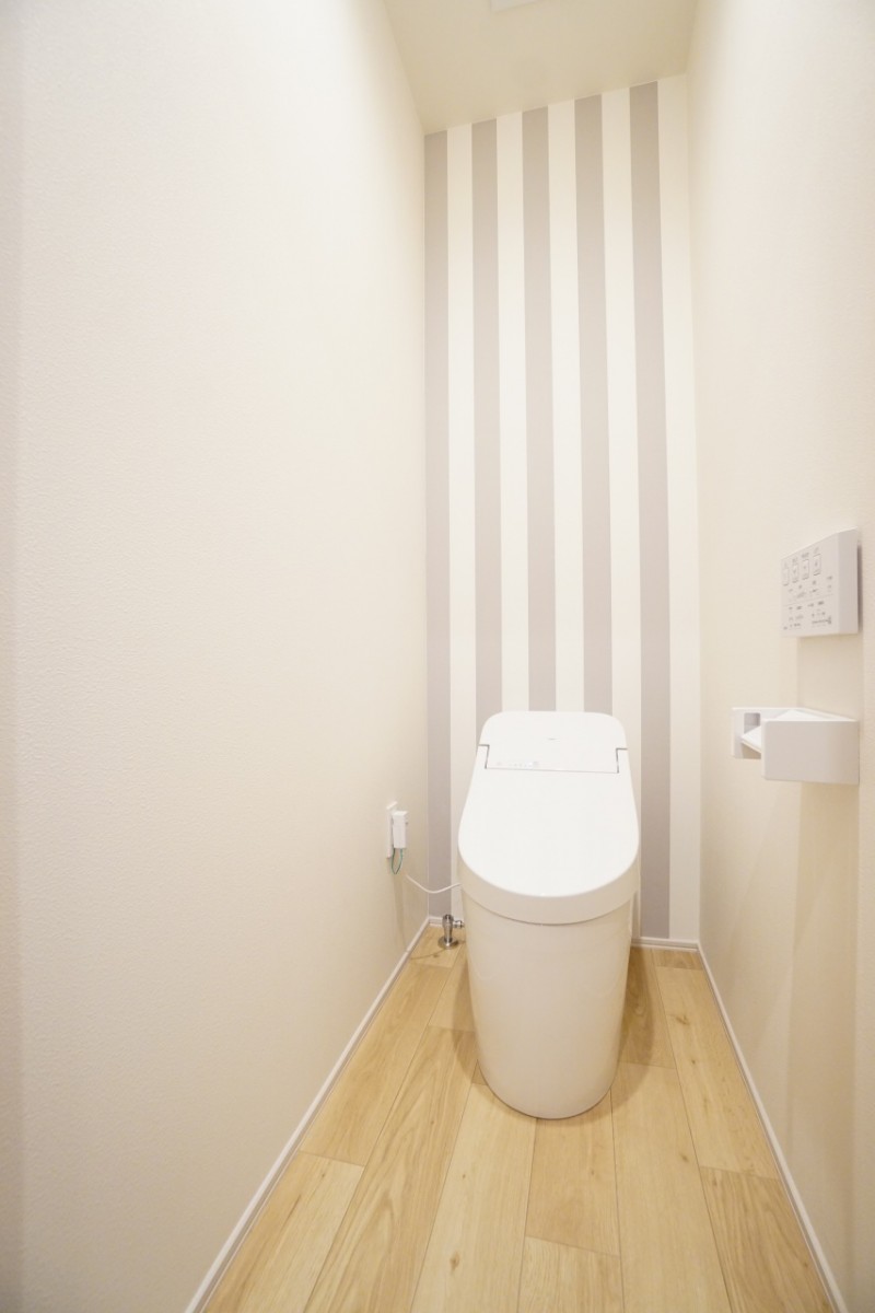タンクレスタイプのトイレを設置。スタイリッシュなデザインでお掃除も楽になります♪節水効果も高く、タンクありトイレと比べて1回あたりの水の使用量は1/3以下!