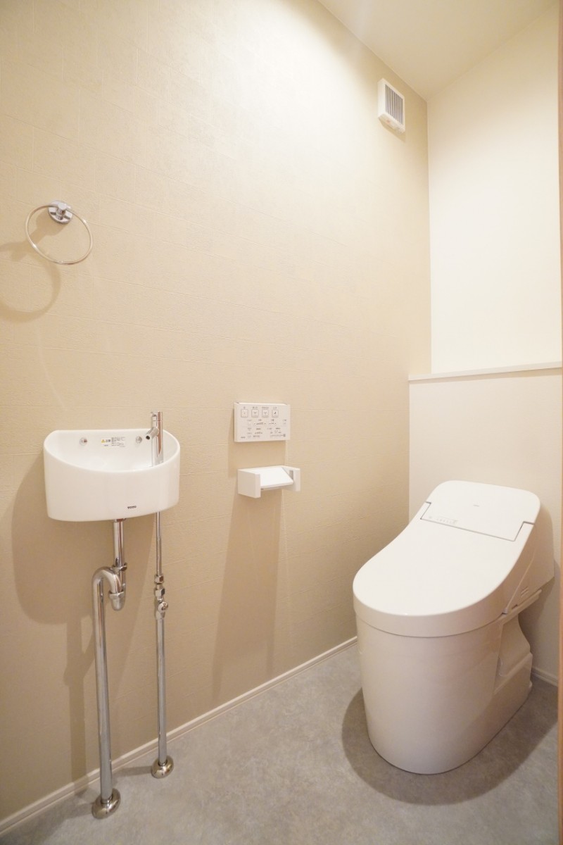 タンクレスタイプのトイレで見た目スッキリ♪清潔感もあります。4人家族の場合、タンクレストイレはタンクありのトイレと比べて年間約1万円以上の節水効果があると言われています。