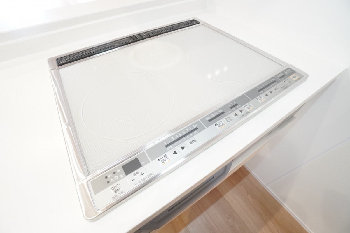 拭き掃除が楽々なIHコンロ。火を使わない安心感もあります!キッチンパネルは凹凸がなく、お手入れが簡単です。
