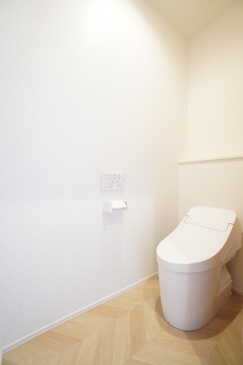 スタイリッシュなデザインのタンクレストイレを採用!タンクありのトイレと比べると1回あたりに使用する水の量はなんと1/3以下。