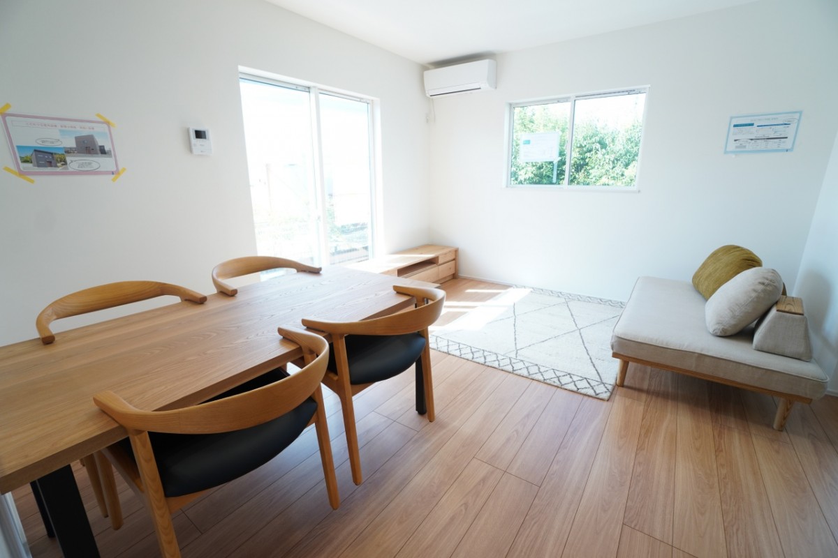 14帖LDK。家具を設置しました♪ダイニングテーブルの他にもテレビ台やソファも置けます!隣の洋室とは3枚扉で仕切れます!