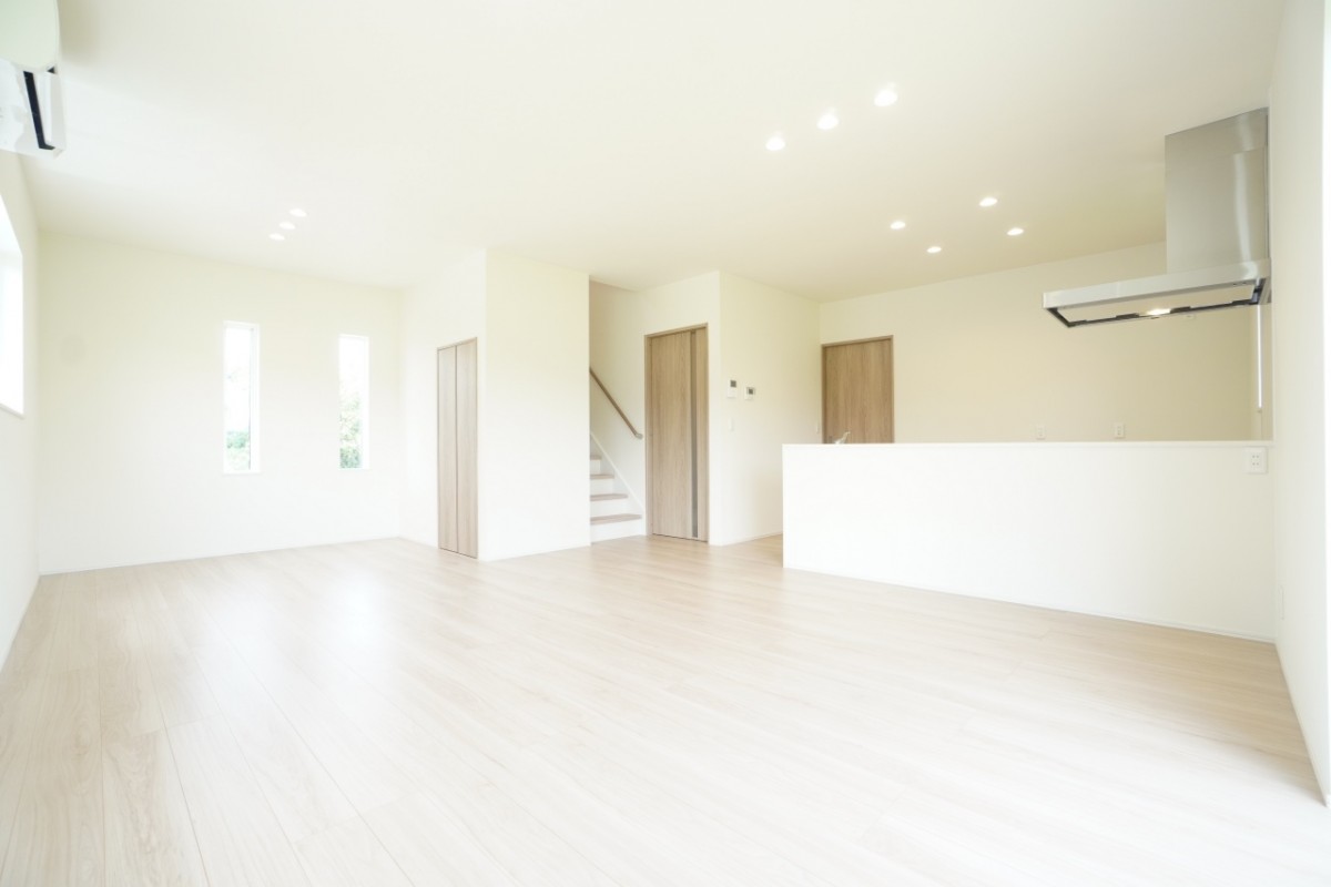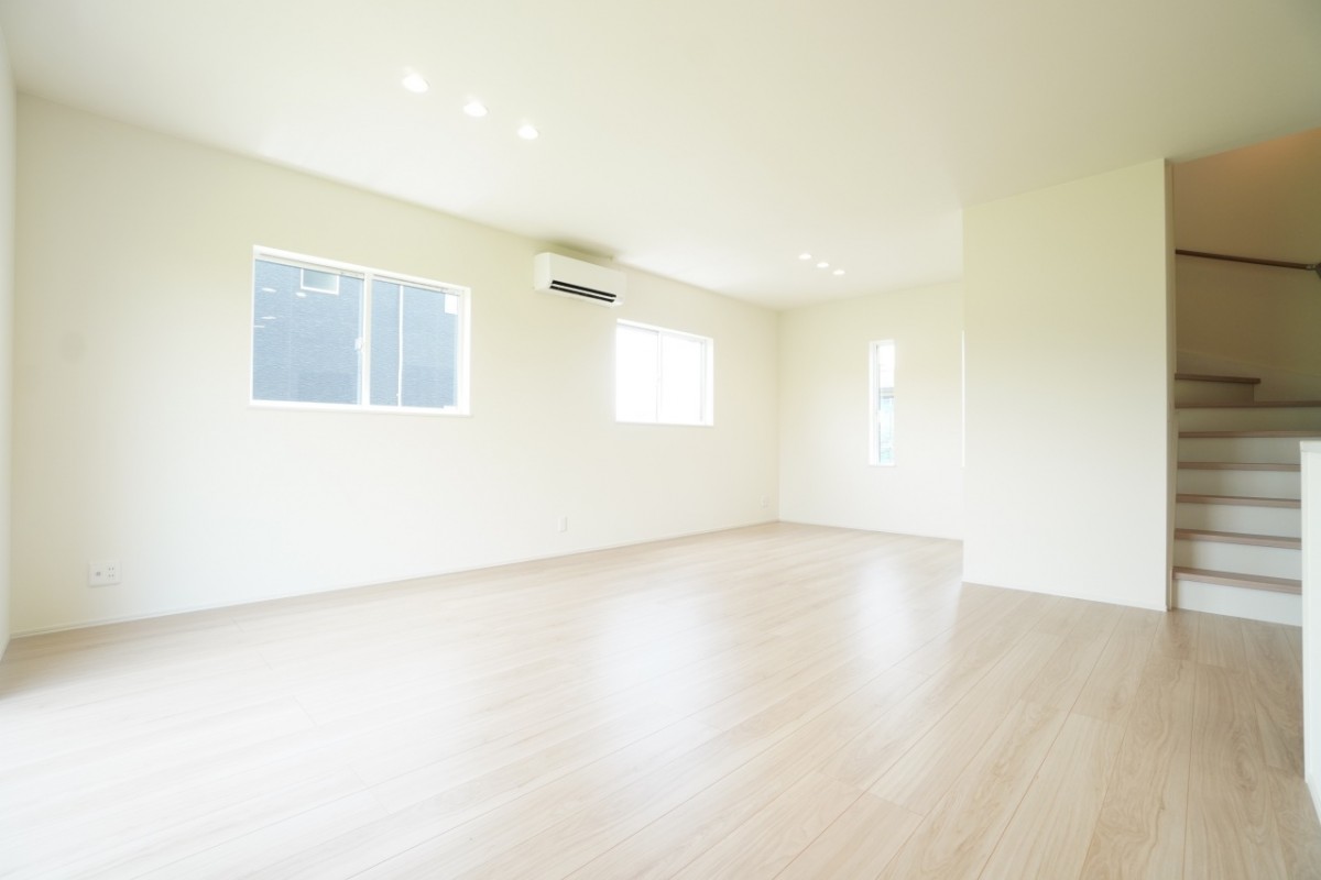 19.5帖の広々リビング♪ダイニングテーブルのほかにテレビ台なども余裕を持って置いていただけます。お子様の遊ぶスペースも十分確保できる、使い勝手の良いリビングです。