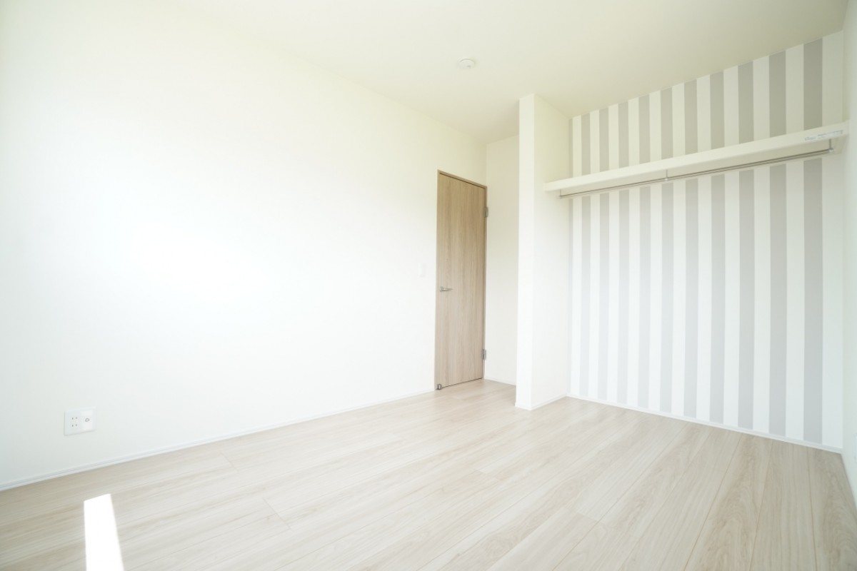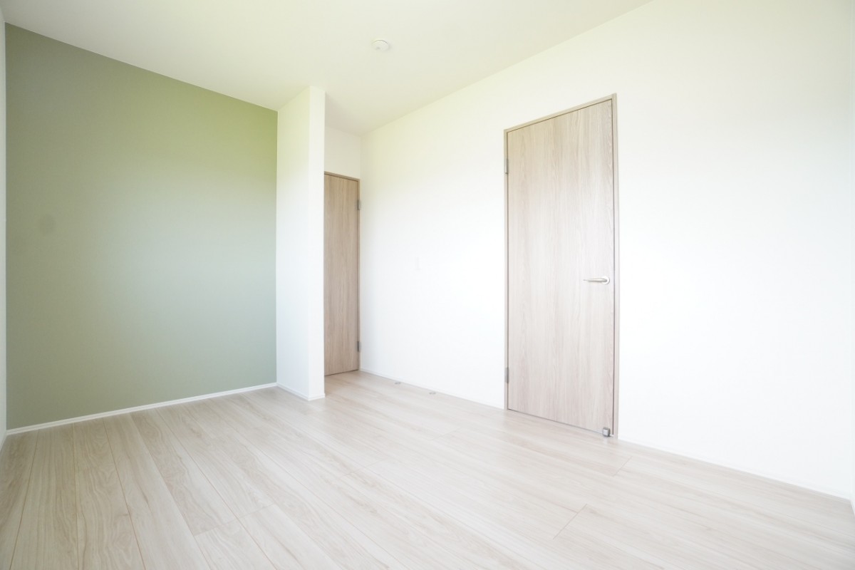 2階6帖洋室。壁にはアクセントクロスが採用されており、部屋の印象を変える役割があります。 また、子供がけんかしないように、部屋の大きさを6帖の洋室で統一しています。