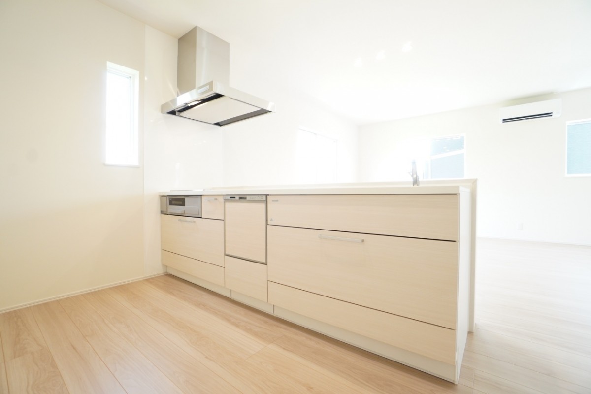 人気のオープンキッチン!IHクッキングヒーターや食洗機など設備充実! キッチンからはリビングに設置してあるテレビを見ながら料理するもよし、子どもをリビングで遊ばせながら様子を見るのもよし。