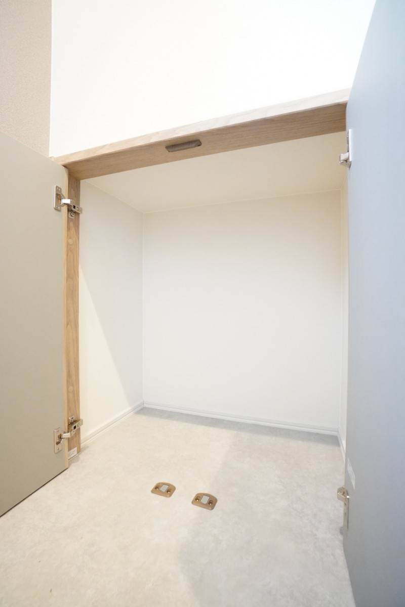 洗面所扉裏収納。タオルや着替えの一時置きにも便利♪ 隠し収納になっており、普段使いしている際には収納が隠れておりますが、洗面所の扉を閉めると収納が現れる一工夫!