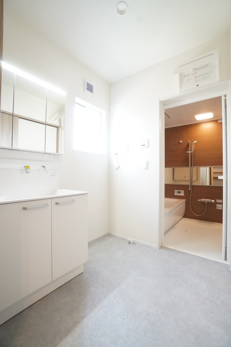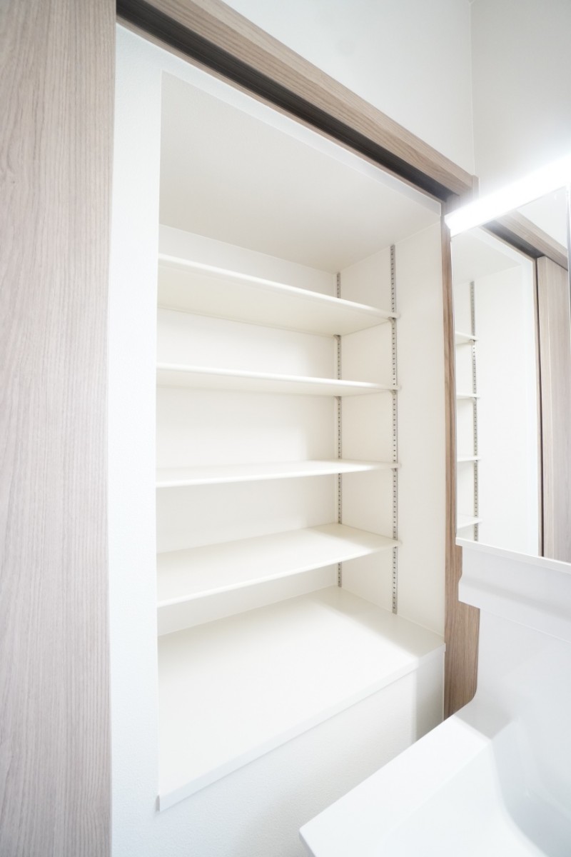 鏡裏に収納スペースがある洗面台を採用。小物を隠せるため、見た目がスッキリします♪ 湿気が気になる洗面所には、耐水性に優れたクッションフロアを採用。