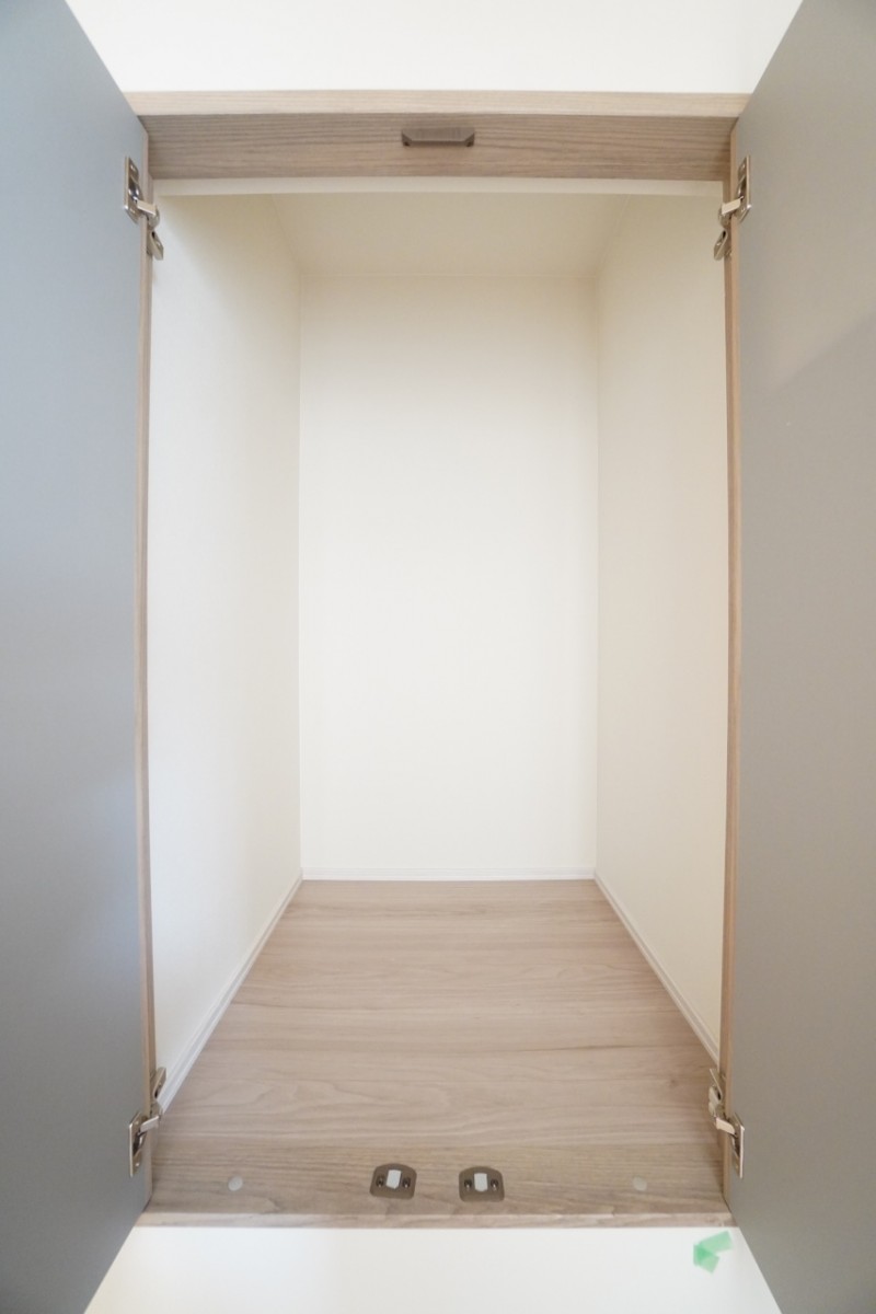 • 洗面所扉裏収納。タオルや着替えの一時置きにも便利♪ 隠し収納になっており、普段使いしている際には収納が隠れておりますが、洗面所の扉を閉めると収納が現れる一工夫!