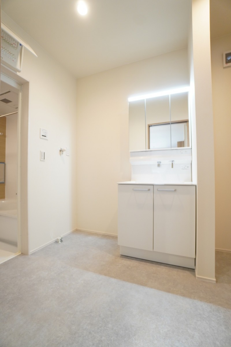 • 広めの洗面所。収納スペースを確保しています!鏡裏に収納スペースがある洗面台を採用。小物を隠せるため、見た目がスッキリします♪
